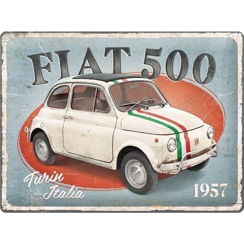 Ein schönes Nostalgic-Art Fiat 500 - Turin Italia 1957 Blechschild. Das Bild auf diesem Zinnbrett ist in mehreren Schichten reliefartig hervorgehoben. Dadurch wird das Bild lebendiger und hat einen nostalgischen Effekt! Die Platte hat einen Schutz aus Klarlack und ist eine charmante und zeitlose Ergänzung Ihrer Einrichtung. Passt auch sehr gut in Ihren Stall oder Ihre Garage. Ein Wandteller für den Fiat-Liebhaber und ein echter Blickfang. Auch sehr schön als originelles Geschenk zu verschenken! Größe: 30x40 cm.