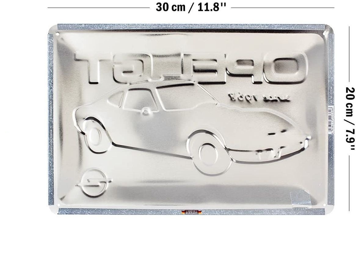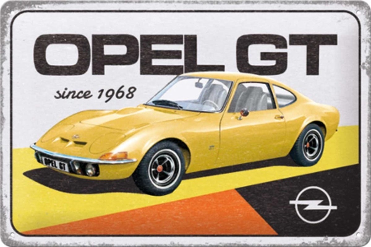 Eine schöne Metallwandplatte eines Opel - GT since 1968 20x30 cm. Eine zeitlose Dekoration mit geschwungenen Kanten und einer reliefartigen Darstellung. Lesen Sie mehr