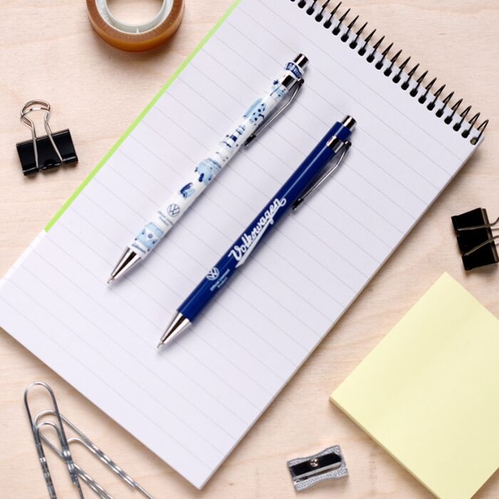 Exclusief ontworpen pennenset bestaande uit één blauwe VW pen met de tekst “Volkswagen” en één VW pen met blauwe T1 busjes en het VW logo erop. Deze balpennenset in Volkswagen T1-thema is voorzien van minutieuze details. Van de strakke rondingen tot het kenmerkende Volkswagen-logo: elk aspect weerspiegelt de onmiskenbare stijl die de Volkswagen T1 tot een symbool van uitmuntende busjes heeft gemaakt. Elke pen in de set is voorzien van officiële licenties, zodat je zeker weet dat je een authentiek Volkswagen-product in handen hebt.